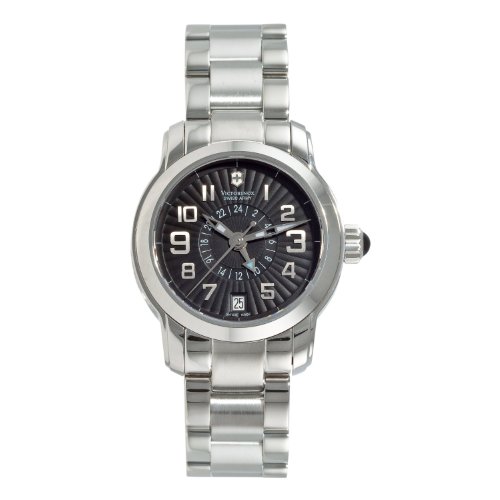 Stainless steel case with a stainless steel link bracelet. Fixed stainless steel bezel. Black guilloche dial with silver-tone hands and white Arabic numeral hour markers. Minute markers. GMT scale. Luminescent hands and dial markers. Date appears at the 6 o'clock position. Quartz movement. Scratch resistant sapphire crystal. Stainless steel crown set with cabochon. Stainless steel case back. Case diameter: 32 mm. Case thickness: 90 mm. Deployment clasp. Water resistant at 100 meters / 330 feet. Victorinox Swiss Army Vivante Dual Time Ladies Watch 241260.