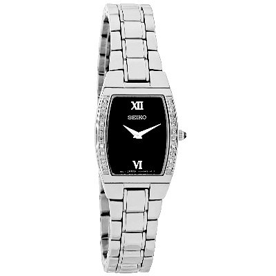 Bold and luxurious, this Seiko Women's Diamond Watch adds elegance to any outfit. Featuring a spare black dial, tapered silver-tone hands, and silver-tone Roman numerals at six and 12 o'clock, all framed by a silver-tone bezel that showcases twenty brilliant diamonds, this timepiece utilizes reliable Japanese quartz movement. A silver-tone tonneau case, cabochon crown, and bracelet band with push-button clasp complete the sophisticated look and feel of this accessory. Also offering reliable Japanese quartz movement and a durable hardlex crystal, this watch is water resistant to 99 feet and is protected by a three-year manufacturer warranty.